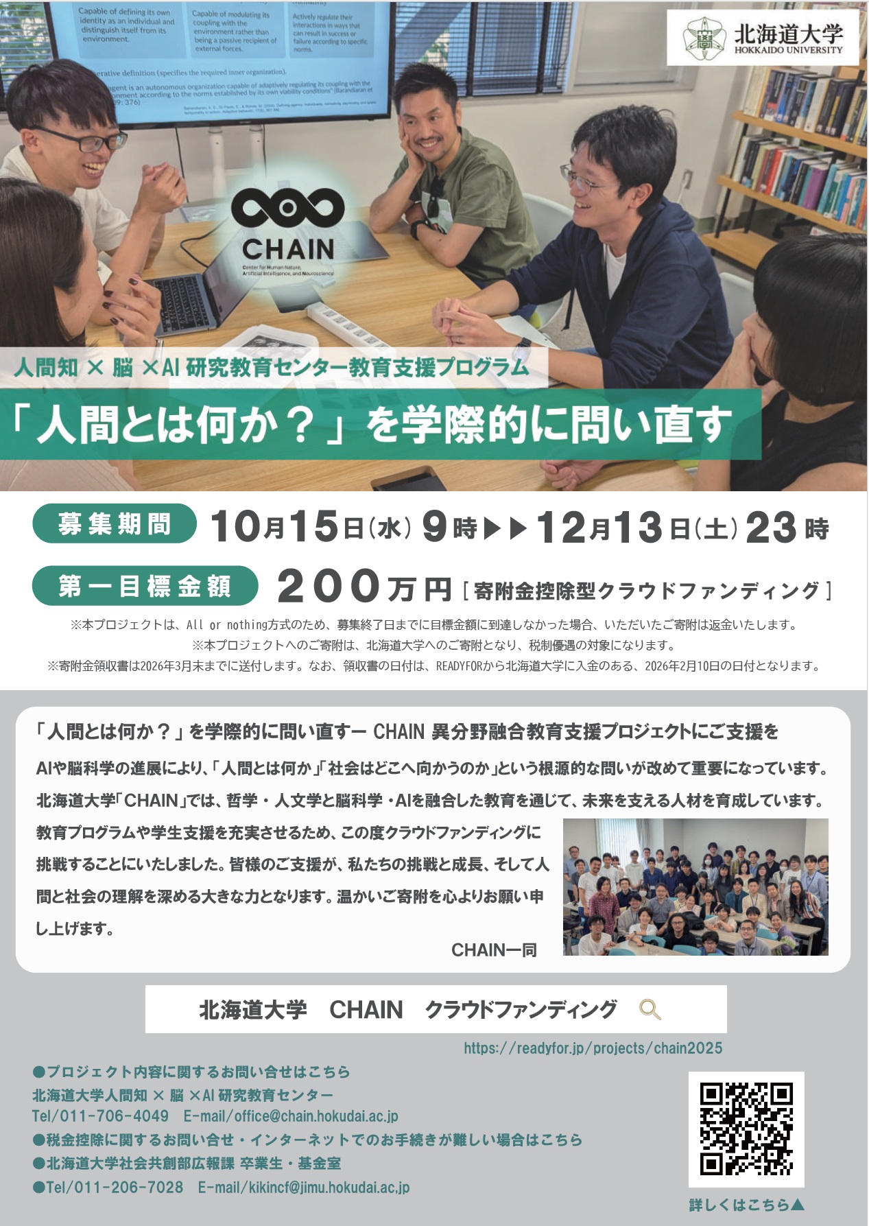 From July 2020, the CHAIN will start a new graduate-level education program integrating humanities and sciences. Master and Ph. D. students majoring humanities, social sciences, neuroscience, and computer science in graduate schools at Hokkaido University can participate in the program provided by the CHAIN. Participants will engage in interdisciplinary joint research on one (or more) of the four main topics – the self, consciousness, sociality, and rationality. Courseworks for acquiring basic and advanced skills and knowledge in related topics will also be provided.